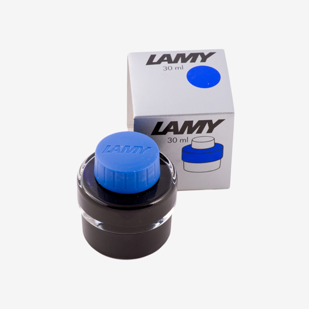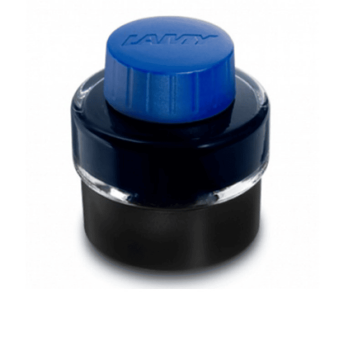 Frasco de tinta LAMY T51 color azul con 30ml. Con fondo anti escurrimiento / base de plástico.