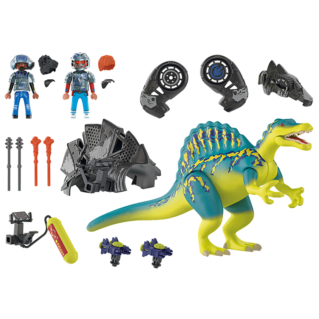Equipado con cañones que disparan, armadura extraíble, las figuras pueden montar en el SpinosaurusCon su afiladísimo diente, el Spinosaurus es uno de los más grandes y peligrosos dinosaurios. Pero este Spinosaurus no es un dinosaurio común. Desde que fue liberado de Dino Rock, él y sus amigos Samu y Ayla luchan codo con codo contra las máquinas de lucha que intentan destruir todo. Gracias al equipo de lucha inteligente de Uncle Rob, el Spinosaurus también tiene una armadura de protección especial y cañones de disparo que hacen que sea más peligroso. ¿Podrá el poder combinado del equipo humano-Spinosaurus parar al robot de la destrucción de la naturaleza?
