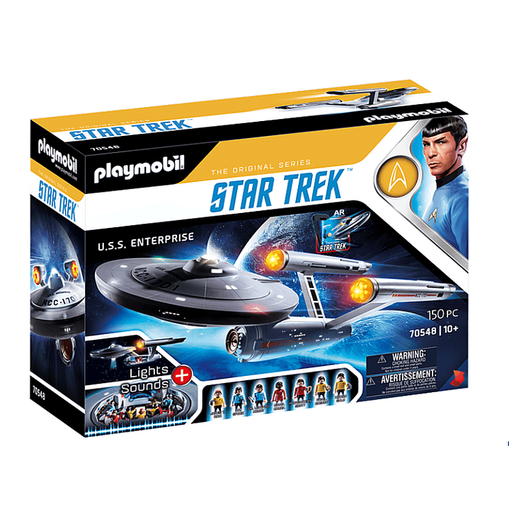 ¡Teletranspórtame, Scotty! Descubre la impresionante U.S.S. Enterprise NCC-1701 bajo una nueva perspectiva con la aplicación interactiva Star Trek AR de Playmobil. Explora la legendaria nave, con su icónico puente y su ingeniería. Interactúa con su famosa tripulación, que incluye a Captain Kirk, Spock, Uhura, McCoy, Sulu, Scotty y Chekov. Diviértete recreando escenas icónicas de la serie original o emprende nuevas aventuras. Con un techo desmontable, ¡se puede jugar con todo el puente y la tripulación! Equipado con efectos de iluminación y sonidos y diálogos originales de la serie, tú también puedes unirte a la aventura de la histórica misión de cinco años de la Enterprise.