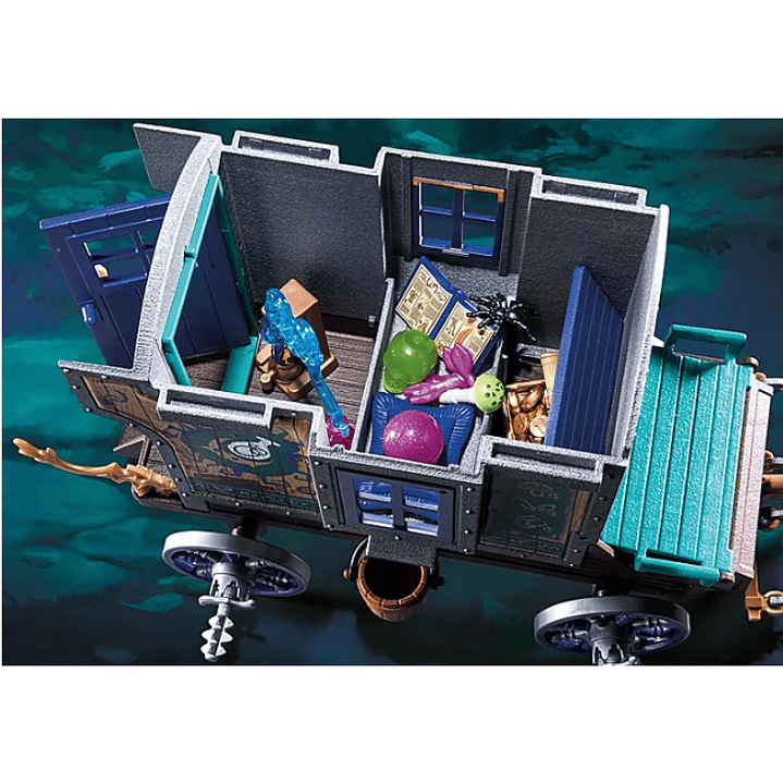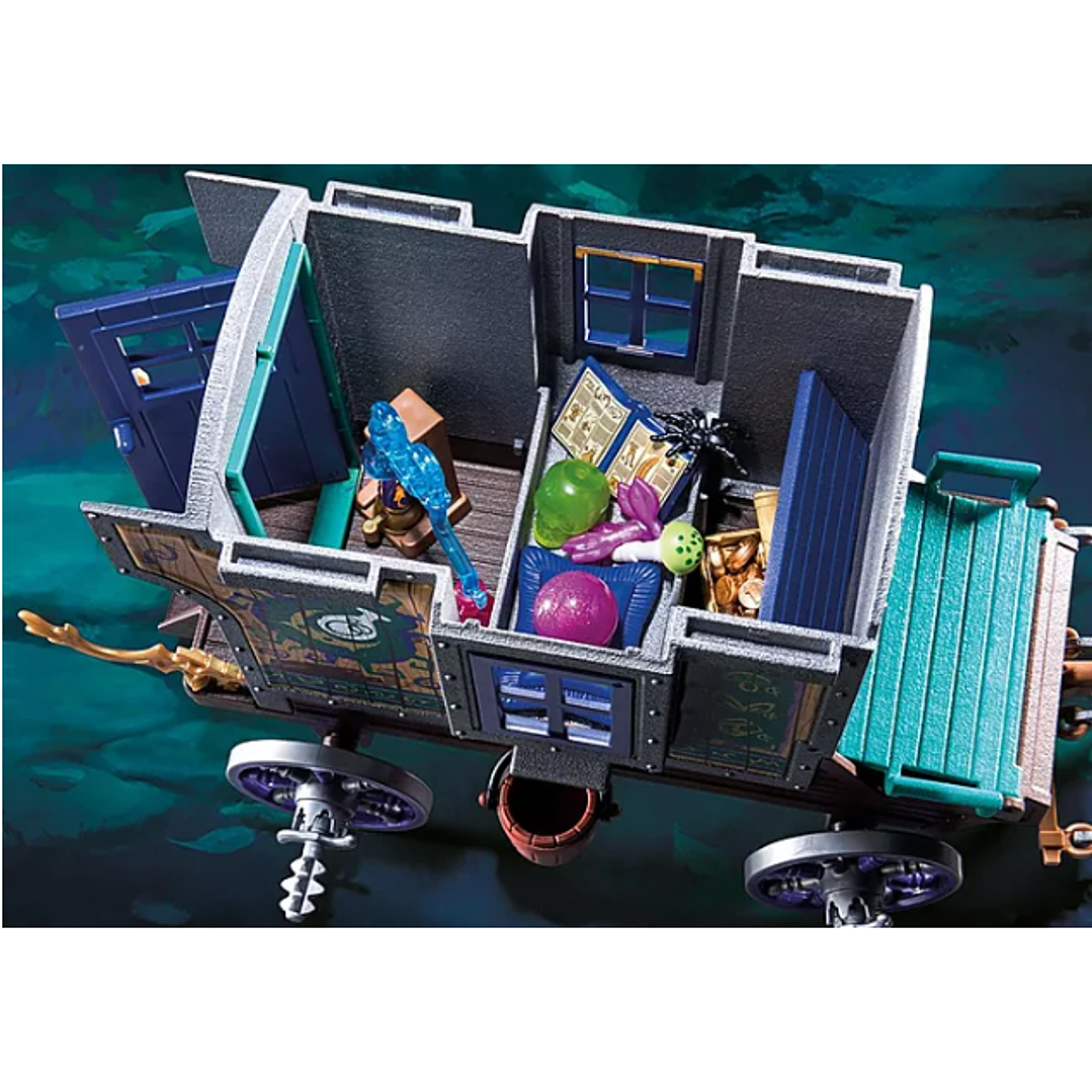 Viaja por las vastas tierras de Novelmore con el Carruaje de Mercaderes. El mago Armathor dirige el equipo mágico de caballos mientras busca hacer negocios con cualquiera que esté dispuesto a pagar el precio adecuado. Armathor guarda tanto sus pertenencias personales como sus bienes comerciales en los distintos compartimentos del carruaje. Incluso hay un espacio de almacenamiento secreto para objetos realmente especiales, como un hacha de fuego de los bandidos de Burnham, un plano de Dario DaVanci y una calavera de cristal mágico de las profundidades de Sal'ahari Sands. Estos objetos están escondidos en un cofre mágico bajo el vagón. Luego, si se presiona el cubo de agua del lado opuesto, el compartimento se vuelve a abrir y los objetos desaparecen como por arte de magia. El vagón tampoco está indefenso: empuja el techo para revelar un cañón oculto que Armathor puede utilizar para ahuyentar a los ladrones. Ahora es una popular serie de YouTube. Sigue la historia hoy mismo: https://bit.ly/NovelmoretheSer.... El set incluye una figura, dos caballos, un carruaje, un bastón de mago, una bola de cristal, mapas, libros, monedas de oro, una armadura y muchos otros tesoros para comerciar.
